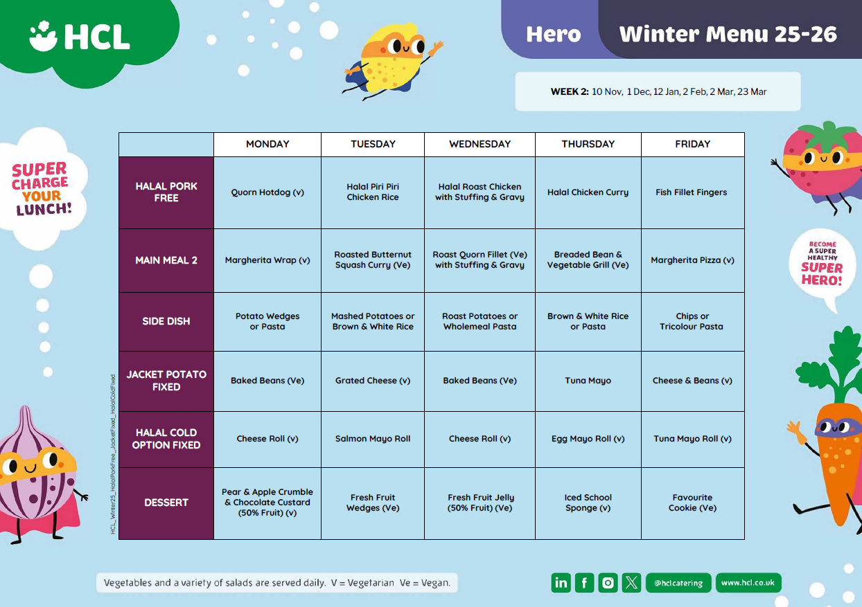 Your child can have a lunch provided by the school or bring in a packed lunch. All school lunches are free. If you would like your child to change from a school lunch to a packed lunch or vice versa then this can only be done at the beginning of the half term. You must notify the school office of this change.